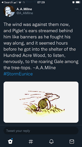Enjoy a well-deserved break with your families and I look forward to seeing you in, hopefully, less stormy times on Monday 28 February. The below is from Twitter this morning, which I thought was a very sweet storm picture!