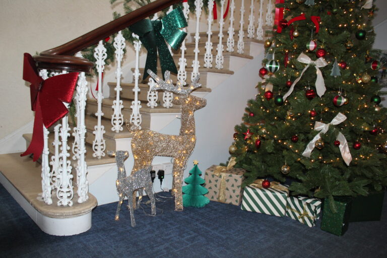 With the wonderful displays in Harefield House now reaching a total of five Christmas trees, and with the arrival of the enormous tree in front