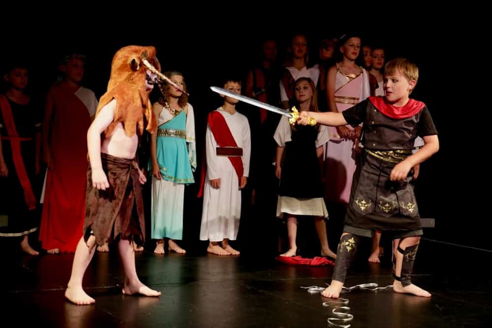The Year 4 production of ‘Greece goes to pieces!’. The Year 4 production is put on at the Blackmore theatre in Exmouth. A real theatre with professional lighting, sound, curtains, back stage etc. What an opportunity for 8 and 9 year olds to have. And it was extremely accomplished. The children were articulate, confident and put on a seriously entertaining performance. The slow-motion wrestling, the rather terrifying minotaur (a fierce Edward), the cast kneeling to mighty Zeus (a very serious Monty raised up above them on a platform), Ariadne, a woman scorned (Emma in all her finger pointing fury) and the hero of all heroes Theseus (Jasper with great timing and stage presence) just to name a few. All the cast had a moment to shine and congratulations to the staff for all of their hard work. Well done.