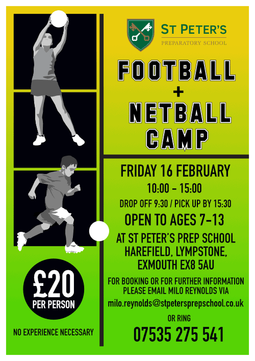 It is not necessary for the children to have any experience of football or netball or to be pupils of St Peter’s. Children can be dropped off from 09:30 and picked up by 15:30 from St Peter’s Preparatory School, Harefield, Lympstone EX8 5AU. Parents are to supply a packed lunch for their child or children. The cost is £20 per child.