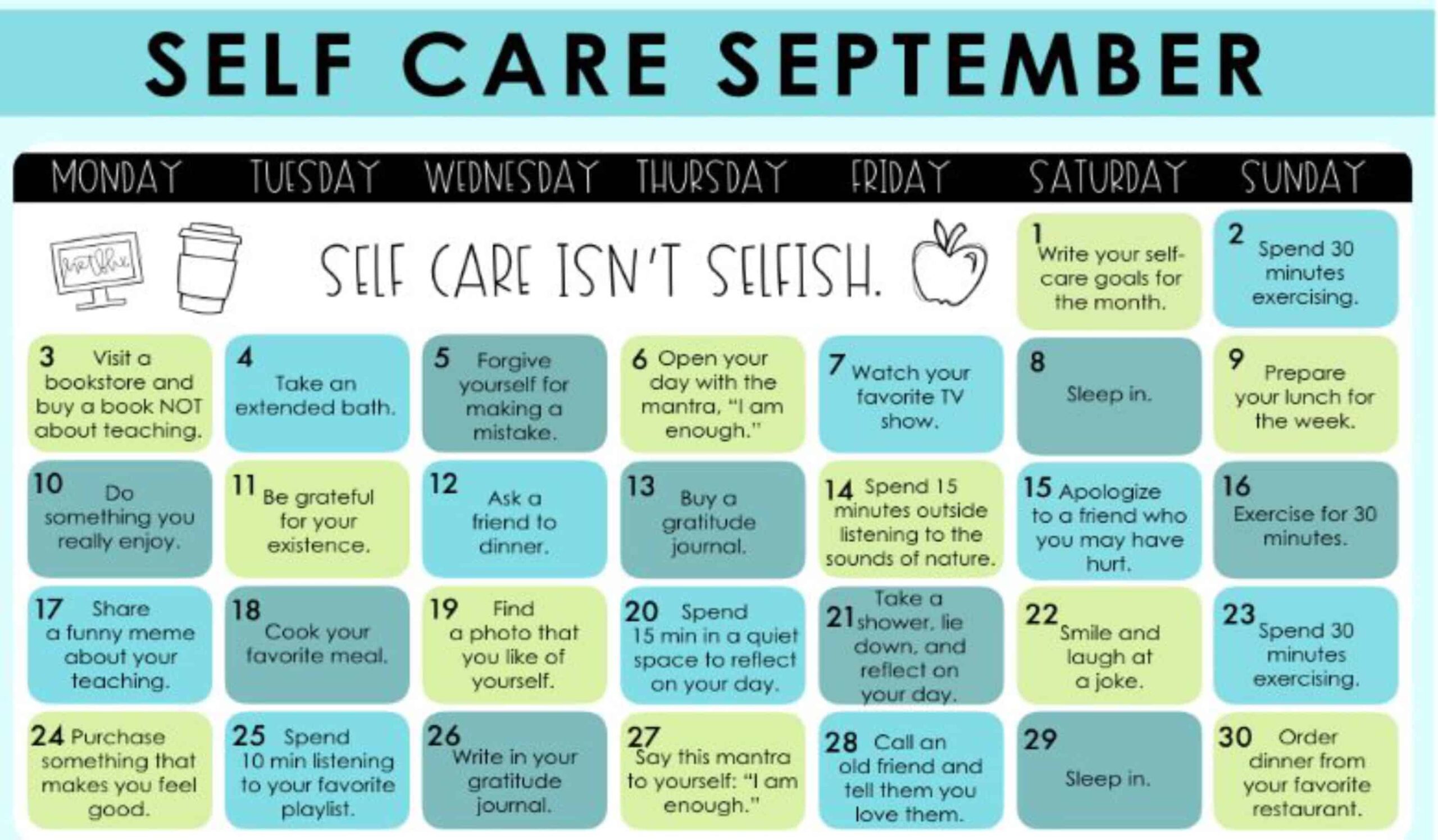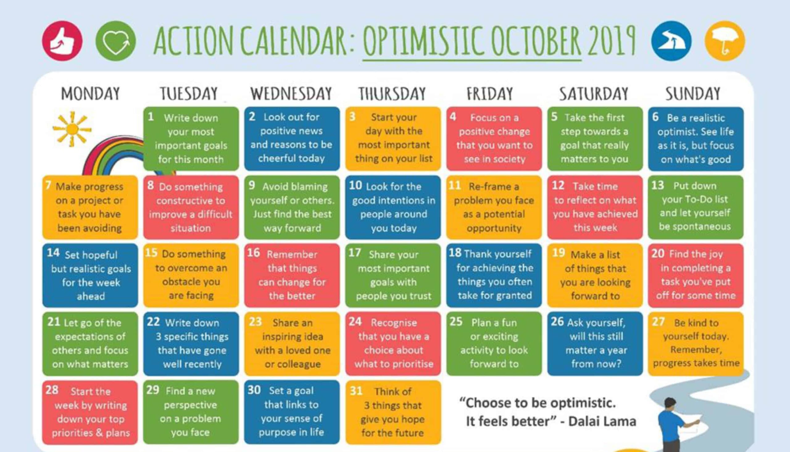 To get everyone off to a good start, please find below a Calendar of Self Care September and an Optimism chart for the month of October. Everyone can start looking at the world from a more optimistic and constructive viewpoint.
